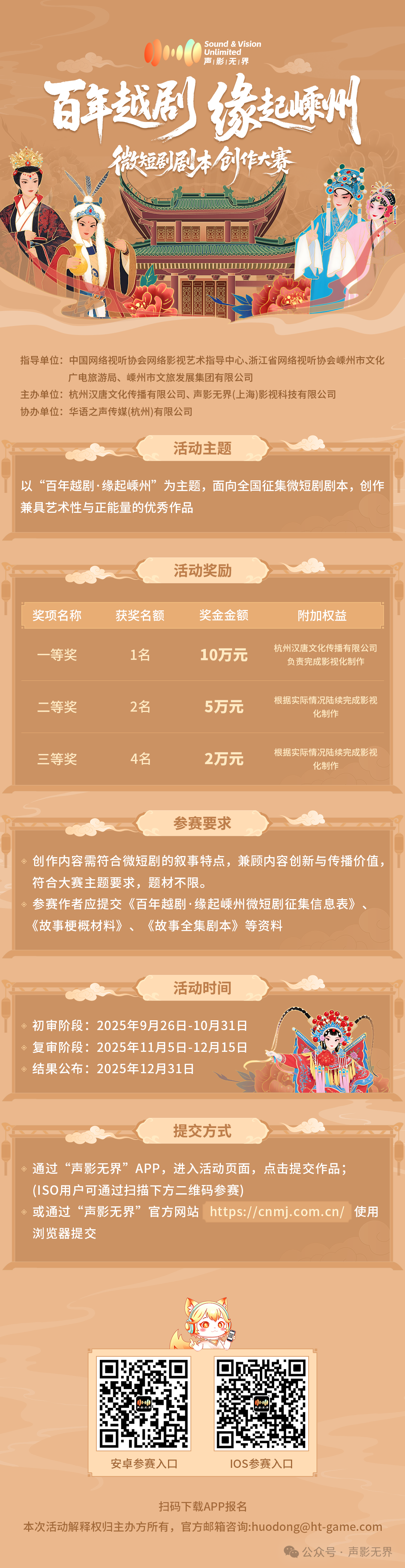 本次大賽以嵊州越劇為背景,面向全國征集優(yōu)秀的微短劇劇本。無論你是資深編劇,還是熱愛創(chuàng)作的新人,只要你有故事、有創(chuàng)意,都有機(jī)會讓作品被看見、被拍攝、被傳播!