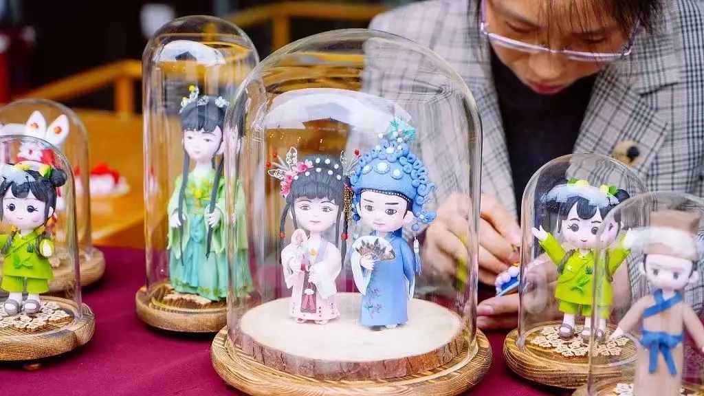 一個(gè)個(gè)玻璃罩子保護(hù)著萌趣的小人兒,隔絕出一個(gè)與世無(wú)爭(zhēng)的空間。才華洋溢的謝靈運(yùn)通過(guò)手藝人的刻畫(huà)穿過(guò)時(shí)間,穿過(guò)書(shū)頁(yè),來(lái)到大家面前,又或是狀元郎錦袍加身,意氣風(fēng)發(fā),祝福著學(xué)子“金榜題名”。