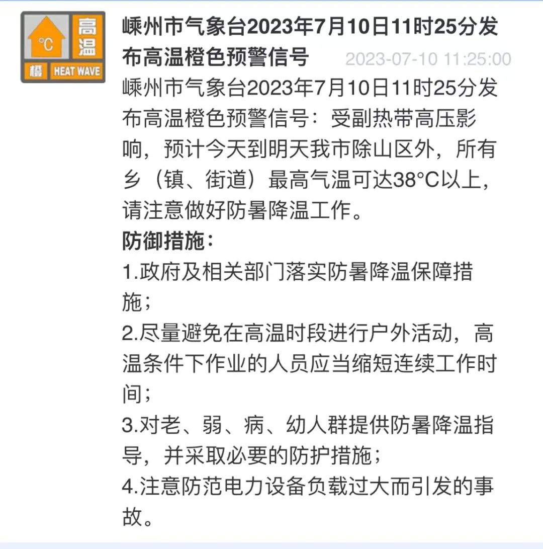嵊州市氣象臺2023年7月10日11時25分發(fā)布高溫橙色預(yù)警信號:受副熱帶高壓影響,預(yù)計今天到明天我市除山區(qū)外,所有鄉(xiāng)(鎮(zhèn)、街道)最高氣溫可達38℃以上,請注意做好防暑降溫工作。