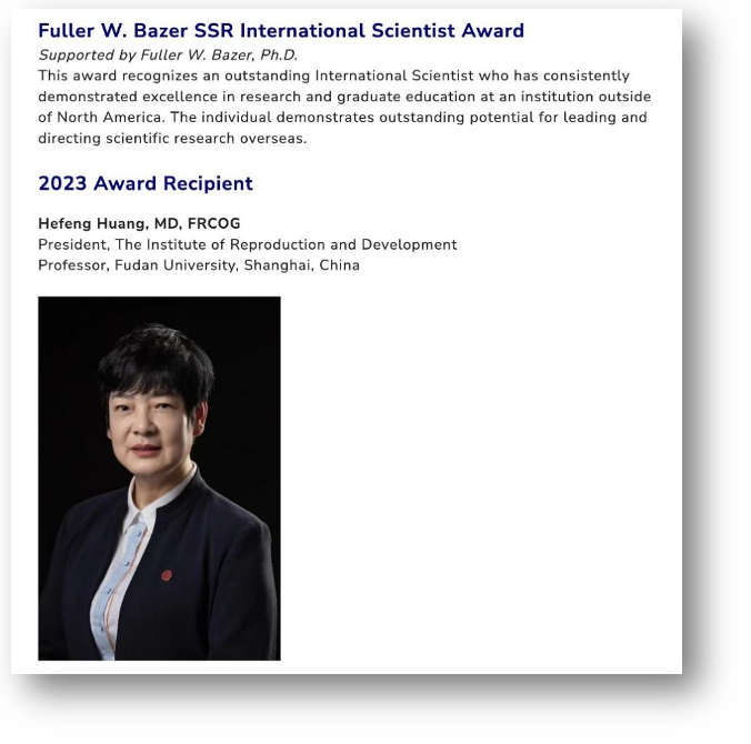 黃荷鳳院士榮獲2023年Fuller W. Bazer SSR國際科學(xué)家獎(圖片來自于官方公告)