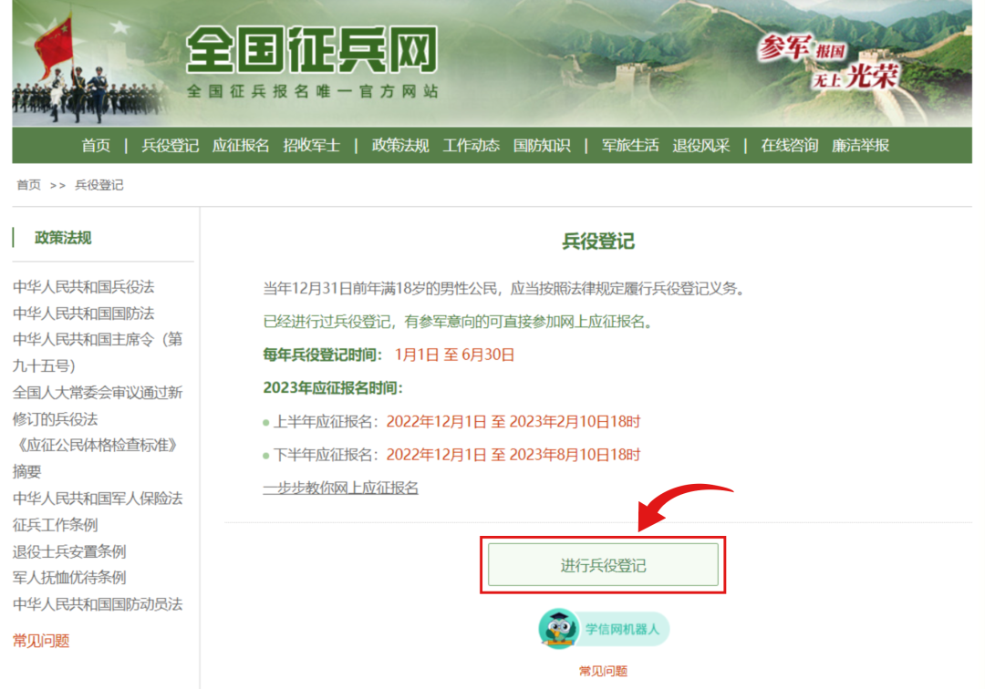 登錄全國征兵網(wǎng)(www.gfbzb.gov.cn/),會(huì)出現(xiàn)以下界面,點(diǎn)擊“應(yīng)征報(bào)名(男兵)”或“應(yīng)征報(bào)名(女兵)”,進(jìn)行跳轉(zhuǎn);