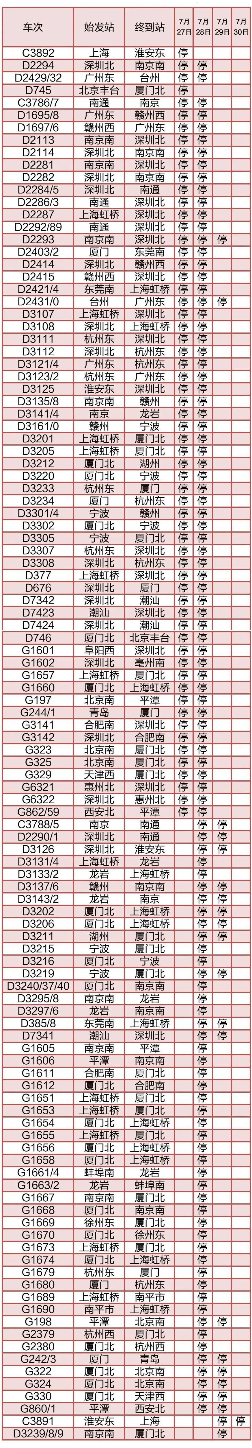 D3201上海虹橋——廈門北,嵊州新昌站出發(fā)時間10:33,停運時間為7月27日、28日。