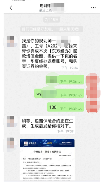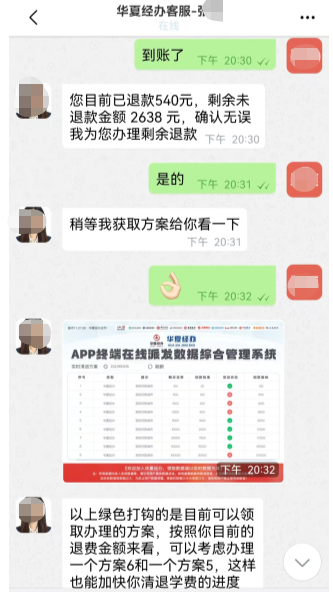 經(jīng)客服介紹退費事項,鄭女士成功被洗腦,點擊群中網(wǎng)址鏈接下載“華夏經(jīng)辦”app,同時有客服專員、規(guī)劃師為鄭女士講解清退操作流程,剛開始對方以需要交易流水為由,要求鄭女士先后向指定賬戶轉(zhuǎn)賬99元、999元并以返利的形式退回部分學費,鄭女士操作后成功收到共計1320元退款,對該機構(gòu)更加的信任。
