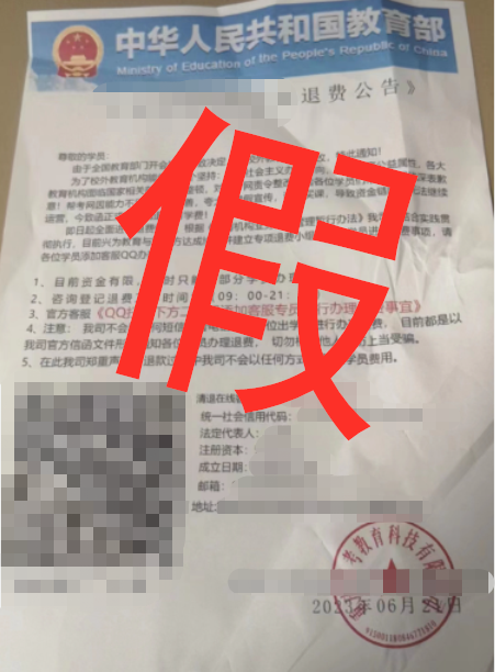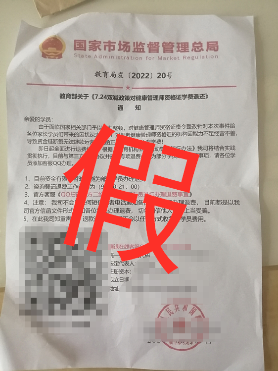 據(jù)了解,近日,鄭女士收到一張標題為“教育部關于《7.24雙減政策對健康管理資格證學費退還》通知”的傳單,其中詳細注明了企業(yè)資質(zhì)等信息,并附有客服二維碼,注明需QQ添加客服專員才能辦理退費事宜。