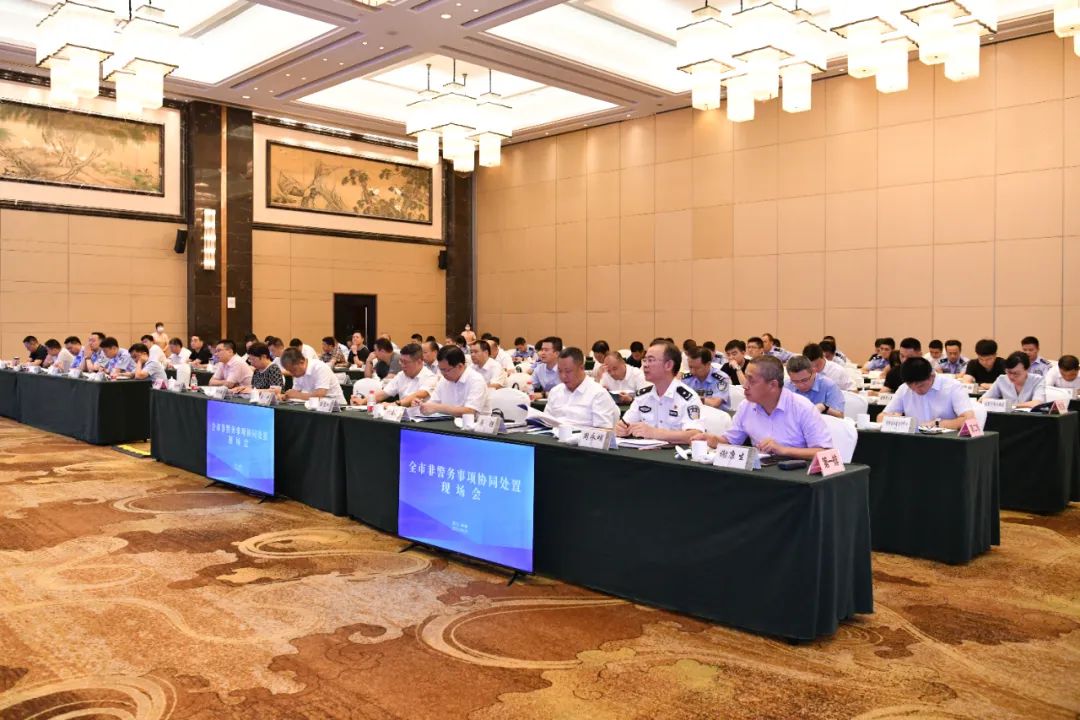 8月3日下午,紹興市委、市政府在嵊州召開全市非警務(wù)事項協(xié)同處置工作現(xiàn)場推進會。紹興副市長、公安局長湯文全出席會議并講話。省廳情報指揮中心副主任張曉良應(yīng)邀出席會議并講話。