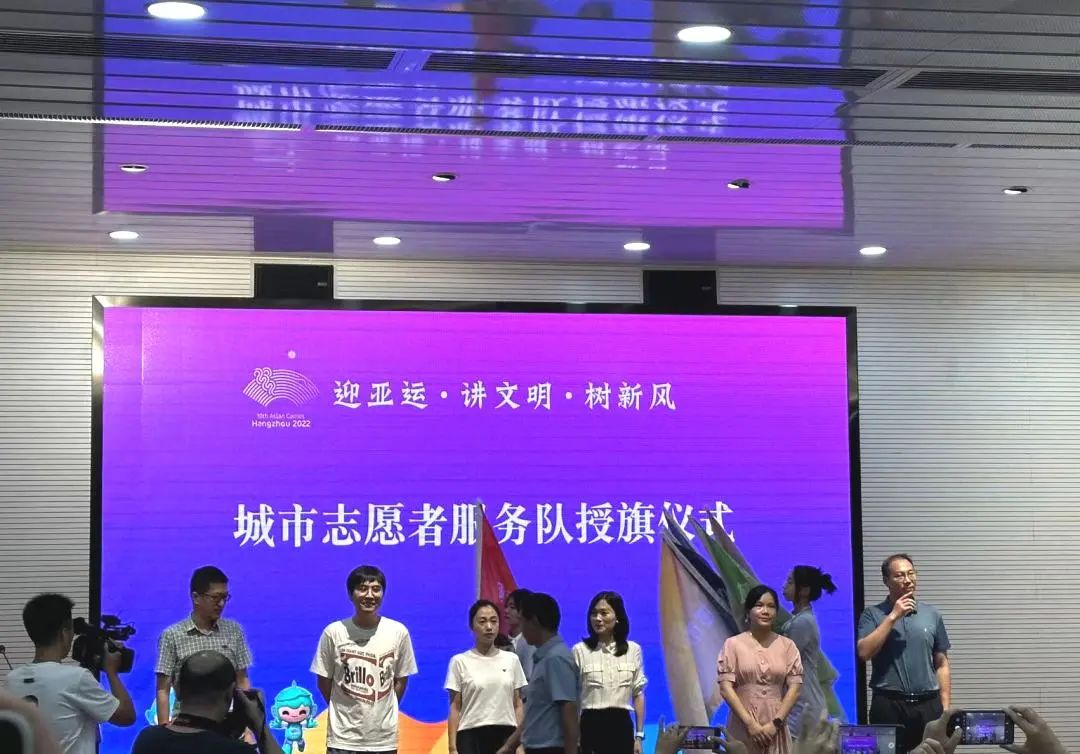 7月28日,嵊州市新時代文明實踐中心參加紹興亞運城市志愿者培訓(xùn)班暨亞運城市志愿者出征儀式。儀式上,嵊州市新時代文明實踐指導(dǎo)中心主任馮波代表嵊州市志愿者服務(wù)隊隊長上臺接受隊旗。