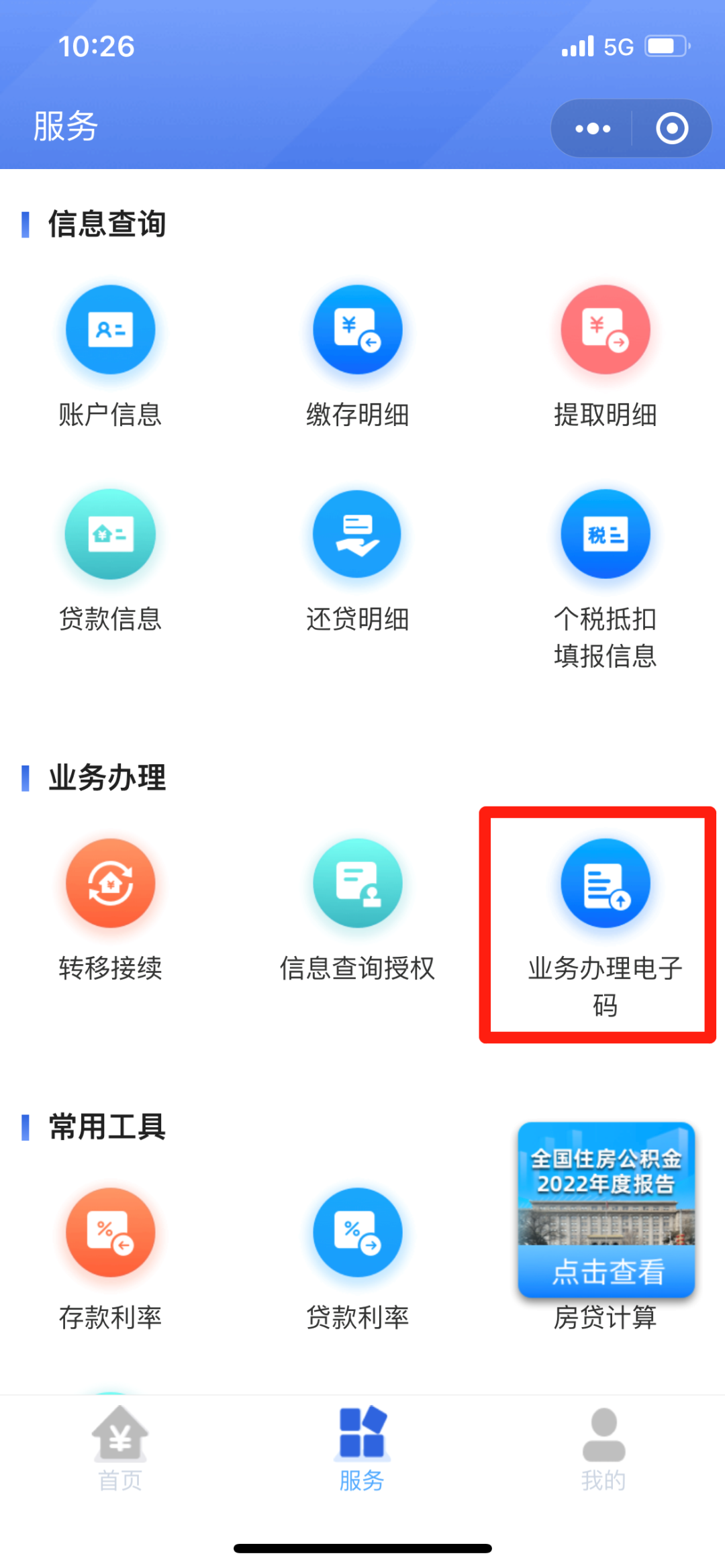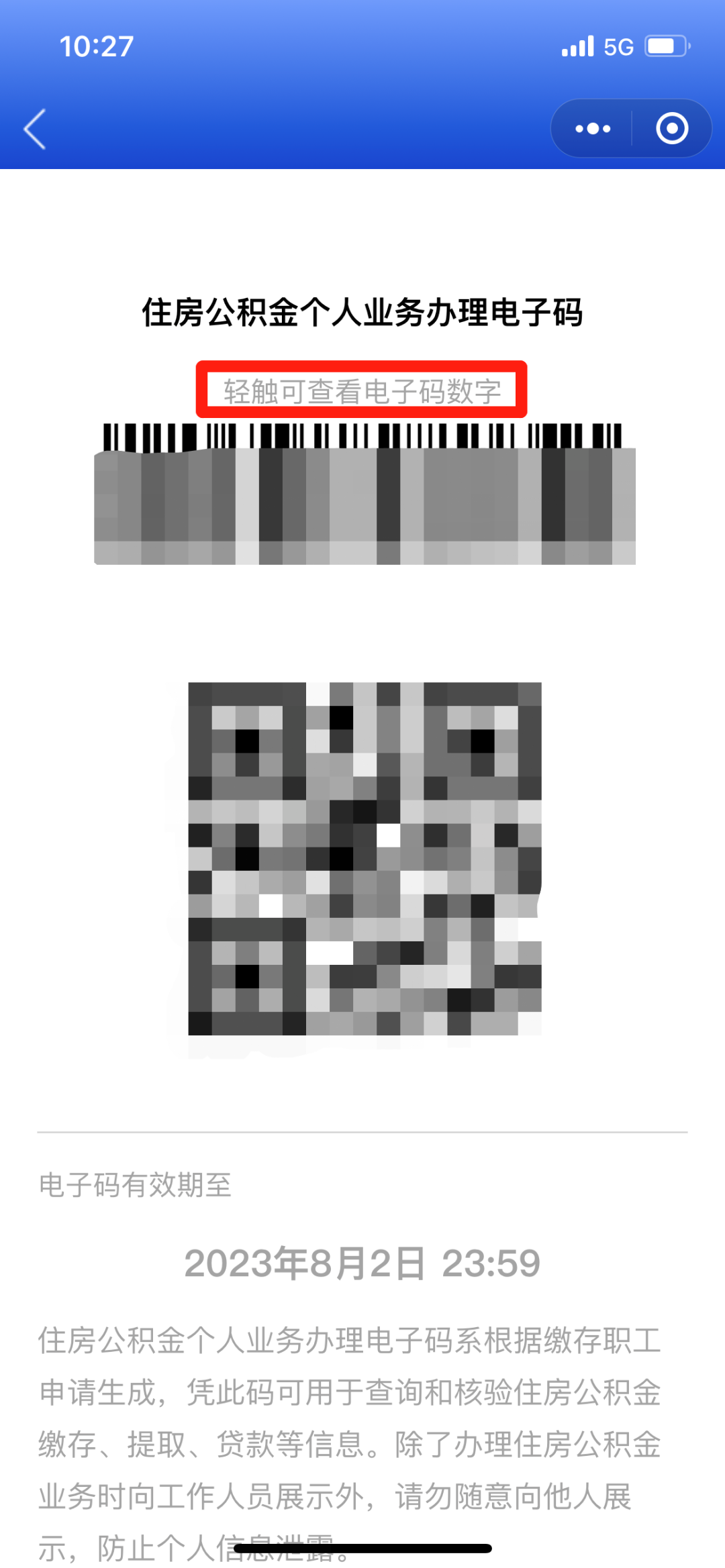 顯示住房公積金個(gè)人業(yè)務(wù)辦理電子碼,輕觸可查看電子碼數(shù)字。