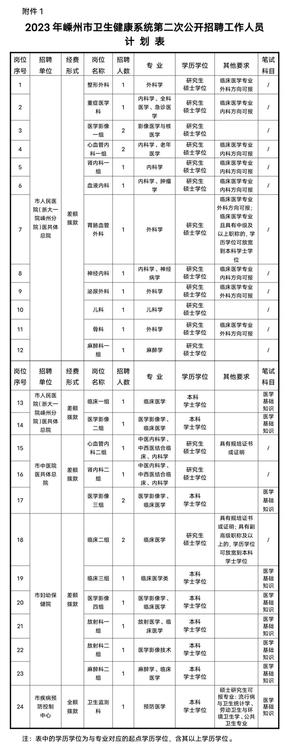 為提高我市醫(yī)療衛(wèi)生單位專業(yè)技術(shù)水平,根據(jù)《浙江省事業(yè)單位公開招聘人員暫行辦法》和《紹興市事業(yè)單位公開招聘工作實(shí)施細(xì)則(試行)》有關(guān)規(guī)定,現(xiàn)將2023年嵊州市衛(wèi)生健康局下屬事業(yè)單位第二次公開招聘工作人員有關(guān)事項(xiàng)公告如下:本次衛(wèi)生健康局下屬事業(yè)單位計(jì)劃公開招聘工作人員28名,具體招聘單位、崗位、人數(shù)和應(yīng)聘資格條件詳見《2023年嵊州市衛(wèi)生健康系統(tǒng)第二次公開招聘工作人員計(jì)劃表》(附件1)。(一)具有中華人民共和國國籍,遵紀(jì)守法,品行端正,愿意履行事業(yè)單位工作人員的義務(wù);(二)具有與招聘崗位要求相適應(yīng)的普通高校學(xué)歷、學(xué)位、專業(yè)等條件,如為國(境)外高校畢業(yè)生的,須提供教育部中國留學(xué)服務(wù)中心出具的境外學(xué)歷學(xué)位認(rèn)證書;招聘崗位要求取得學(xué)位的,學(xué)位證書上的專業(yè)應(yīng)與畢業(yè)證書上的專業(yè)一致,2021年及以前畢業(yè)的考生和研究生學(xué)歷的考生還須取得相應(yīng)的執(zhí)(專)業(yè)資格證書(或成績(jī)合格證明);(三)下列情形同等對(duì)待:面向社會(huì)招收的住院醫(yī)師如為普通高校應(yīng)屆畢業(yè)生的,其住培合格當(dāng)年在醫(yī)療衛(wèi)生機(jī)構(gòu)就業(yè),按當(dāng)年應(yīng)屆畢業(yè)生同等對(duì)待;經(jīng)住培合格的本科學(xué)歷臨床醫(yī)師,按臨床醫(yī)學(xué)、口腔醫(yī)學(xué)、中醫(yī)專業(yè)學(xué)位碩士研究生同等對(duì)待(其中住培合格證書中的培訓(xùn)專業(yè)原則上應(yīng)當(dāng)與招聘崗位的專業(yè)或類別要求相一致);(四)年齡要求在35周歲及以下(1987年8月24日之后出生),具有博士研究生、副高職稱及以上人員年齡要求在45周歲及以下(1977年8月24日之后出生),以身份證出生日期為準(zhǔn);(五)應(yīng)聘對(duì)象不限戶籍范圍;(六)具有適應(yīng)崗位工作要求的身體條件;1.在普通高校就讀的非2023年應(yīng)屆畢業(yè)生不能應(yīng)聘,在普通高校脫產(chǎn)就讀的非2023年應(yīng)屆畢業(yè)的專升本人員、研究生也不能以原已取得的學(xué)歷、學(xué)位證書應(yīng)聘;2.屬于《公務(wù)員錄用考察辦法(試行)》(中組發(fā)〔2021〕11號(hào))規(guī)定不得確定為錄用人選情形之一的;3.應(yīng)聘人員不得應(yīng)聘與招聘單位有《浙江省事業(yè)單位公開招聘人員暫行辦法》第三十條所列回避情形的崗位;5.被依法列為失信聯(lián)合懲戒對(duì)象的人員;6.嵊州市衛(wèi)生健康局下屬事業(yè)單位擬聘用人員或在編人員;7.不宜聘用為事業(yè)單位工作人員的其他情形。本次招聘工作包括報(bào)名及資格審查、考試、體檢、考察、公示、聘用等程序。1.報(bào)名時(shí)間:2023年8月24日(周四)-8月25日(周五),上午8:30-12:00,下午14:30-17:00,逾期不再受理。2.報(bào)名地點(diǎn):嵊州市衛(wèi)生健康局五樓大會(huì)議室(嵊州市三江街道興旺街1號(hào))。3.現(xiàn)場(chǎng)報(bào)名需提供以下材料:打印的報(bào)名表一份(附件2),身份證、畢業(yè)證書、學(xué)位證書、教育部學(xué)歷證書電子注冊(cè)備案表及其他報(bào)考職位所需證件(證明)的原件及復(fù)印件。 除按上述要求外,下列人員還須提供以下材料的原件及復(fù)印件:2021年及以前畢業(yè)的考生和研究生學(xué)歷的考生還須提供執(zhí)(專)業(yè)資格證書(或成績(jī)合格證明);國(境)外高校畢業(yè)生還須提供教育部中國留學(xué)服務(wù)中心出具的境外學(xué)歷學(xué)位認(rèn)證書原件及復(fù)印件;研究生畢業(yè)證書上專業(yè)名稱只有臨床醫(yī)學(xué)等一級(jí)學(xué)科的,還需提供畢業(yè)院校蓋章的研究方向書面證明;2023年住培合格的本科學(xué)歷臨床醫(yī)師(只限臨床醫(yī)學(xué)、口腔醫(yī)學(xué)、中醫(yī)專業(yè)),如報(bào)考相應(yīng)碩士研究生崗位的,需提供2023年住培合格證書或成績(jī)合格證明;定向委培生還須提供委托培養(yǎng)單位同意報(bào)考的書面證明;若應(yīng)聘人員是機(jī)關(guān)、事業(yè)單位在編人員,還應(yīng)提供所在單位和主管部門同意報(bào)考的證明(同意報(bào)考證明必須在2023年7月24日后出具的方為有效),不能提供的,視作不符合應(yīng)聘要求。每人限報(bào)一個(gè)崗位,多報(bào)的崗位無效。同時(shí),考生所報(bào)考崗位一經(jīng)確認(rèn),不得更改。 資格審查通過人數(shù)不足招聘計(jì)劃數(shù)3倍的崗位,將根據(jù)招聘主管部門意見適當(dāng)降低招聘比例或核減、取消招聘計(jì)劃。已報(bào)考但被取消招聘計(jì)劃崗位的應(yīng)聘人員由招聘單位及時(shí)聯(lián)系,并允許其在規(guī)定時(shí)間內(nèi)改報(bào)其他符合應(yīng)聘條件的崗位,因考生自身原因,無法正常聯(lián)絡(luò)或接到通知后逾期未改報(bào)的,視作放棄改報(bào)。 采用分類考試形式,招聘條件學(xué)歷學(xué)位要求為研究生碩士學(xué)位的或其他要求為中級(jí)(副高級(jí))及以上職稱的崗位采取直接面試的考試方式,其他崗位采取筆試加面試的考試方式。1.筆試。筆試時(shí)間初定為9月2日(周六)上午,最終考試時(shí)間和地點(diǎn)以準(zhǔn)考證為準(zhǔn),考試不指定參考復(fù)習(xí)用書,考試科目為醫