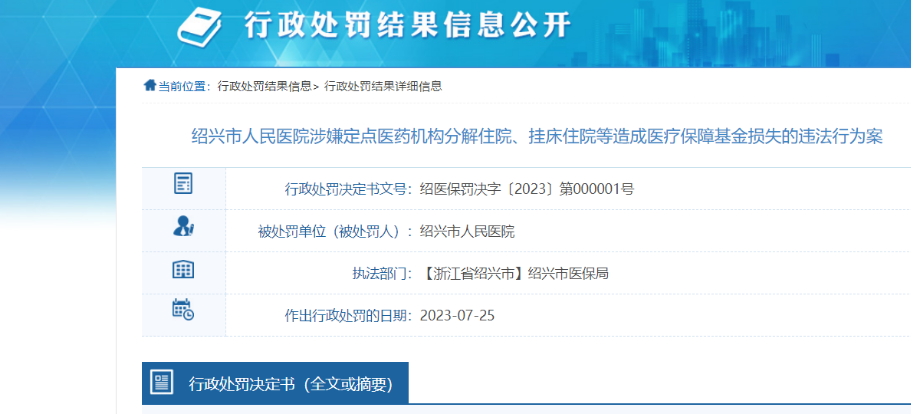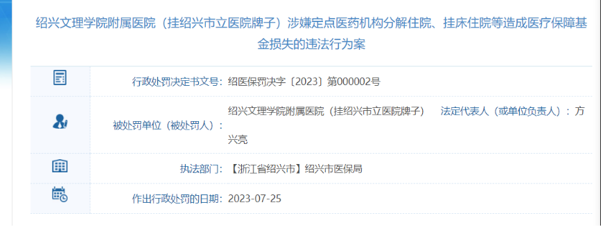 日前,浙江省人民政府網(wǎng)公開了2則行政處罰結(jié)果:紹興市人民醫(yī)院涉嫌定點(diǎn)醫(yī)藥機(jī)構(gòu)分解住院、掛床住院等造成醫(yī)療保障基金損失的違法行為案和紹興文理學(xué)院附屬醫(yī)院(掛紹興市立醫(yī)院牌子) 涉嫌定點(diǎn)醫(yī)藥機(jī)構(gòu)分解住院、掛床住院等造成醫(yī)療保障基金損失的違法行為案。