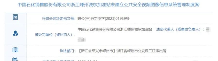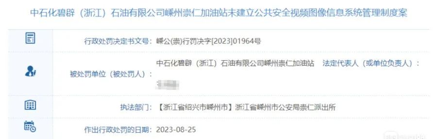 主要違法事實:2023年08月25日09時許,中石化碧辟(浙江)石油有限公司嵊州崇仁加油站未建立公共安全視頻圖像信 息系統(tǒng)管理制度被查獲。行政處罰的種類和依據(jù):根據(jù)《中華人民共和國反恐怖主義法》第八十八條第一款(六)項之規(guī)定,決定給予警告的行政處 罰。行政處罰的執(zhí)行方式和期限:當(dāng)場訓(xùn)誡。