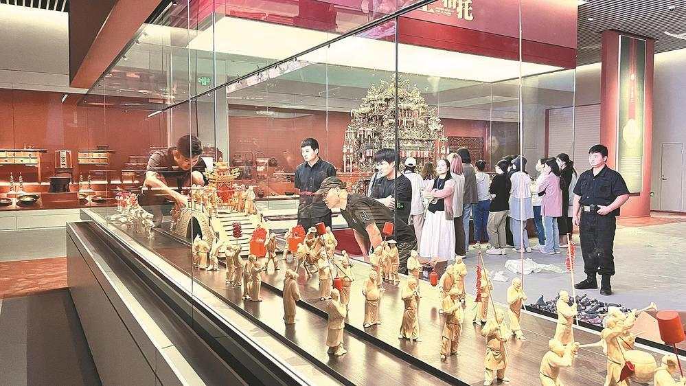 近日,經(jīng)過2個多小時的安裝,微縮版木雕作品“十里紅妝”的雄姿終于展露在浙江省博物館之江新館的民俗文化館中。