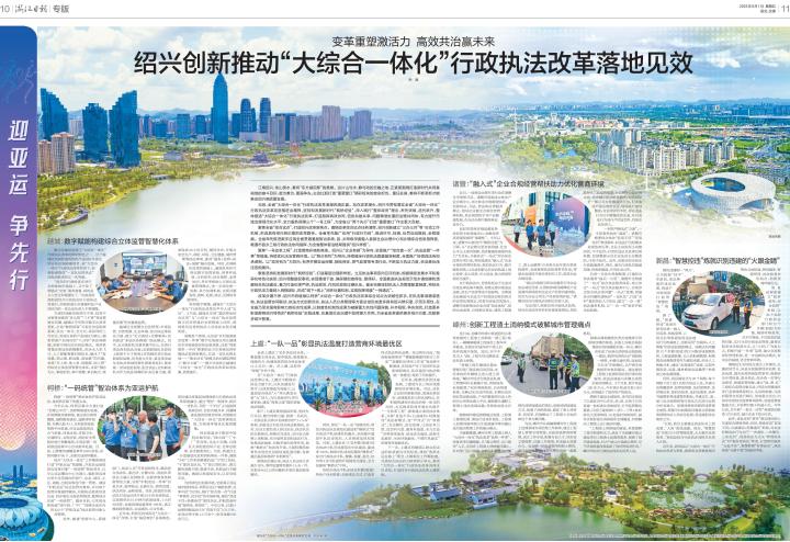 站在改革潮頭,紹興市貫徹落實(shí)全省“大綜合一體化”行政執(zhí)法改革攻堅(jiān)推進(jìn)會(huì)精神,堅(jiān)持和發(fā)展新時(shí)代“楓橋經(jīng)驗(yàn)”,深入踐行“整體政府”理念,率先突破、迭代躍升,整體推進(jìn)“大綜合一體化”行政執(zhí)法改革,打造指揮高效協(xié)同、信息共建共享、問(wèn)題精準(zhǔn)處置的治理共同體。今日出版的浙江日?qǐng)?bào)對(duì)此進(jìn)行專版報(bào)道。