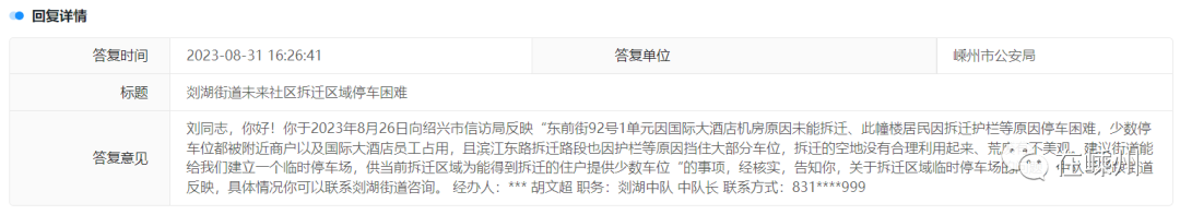 答:經(jīng)核實,告知你,關(guān)于拆遷區(qū)域臨時停車場的問題,中隊已經(jīng)跟街道反映,具體情況你可以聯(lián)系剡湖街道咨詢。
