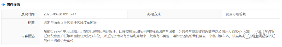 東前街92號1單元因國際大酒店機房原因未能拆遷、此幢樓居民因拆遷護欄等原因停車?yán)щy,少數(shù)停車位都被附近商戶以及國際大酒店員工占用,且濱江東路拆遷路段也因護欄等原因擋住大部分車位,拆遷的空地沒有合理利用起來、荒廢有不美觀。建議街道能給我們建立一個臨時停車場,供當(dāng)前拆遷區(qū)域為能得到拆遷的住戶提供少數(shù)車位。