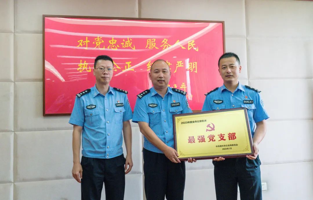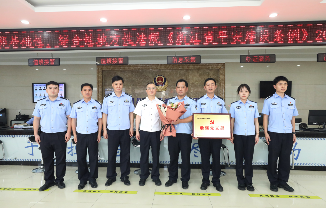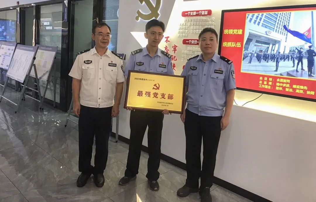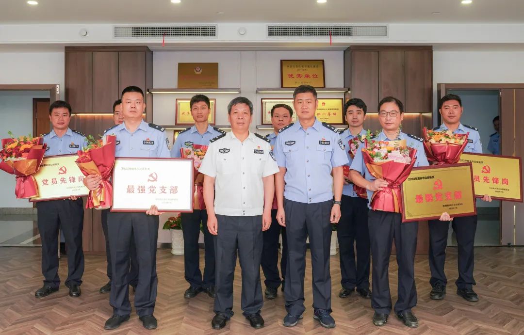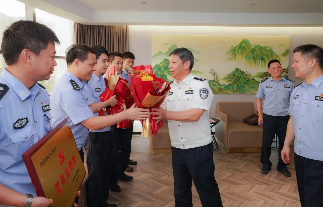 市局黨委委員周永明為榮獲全市公安機關最強黨支部的市局情指行合成作戰(zhàn)中心黨總支情報指揮黨支部,榮獲個人嘉獎的市局情報指揮中心綜合指揮大隊大隊長盛佐鈞等集體和個人送獎。