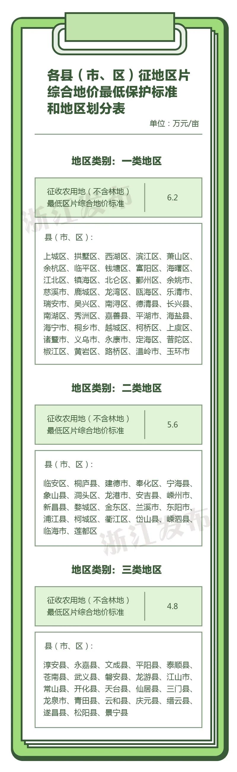 全省征收農民集體所有農用地區(qū)片綜合地價最低保護標準:征收農用地(不含林地),一類地區(qū)不低于6.2萬元/畝、二類地區(qū)不低于5.6萬元/畝、三類地區(qū)不低于4.8萬元/畝。