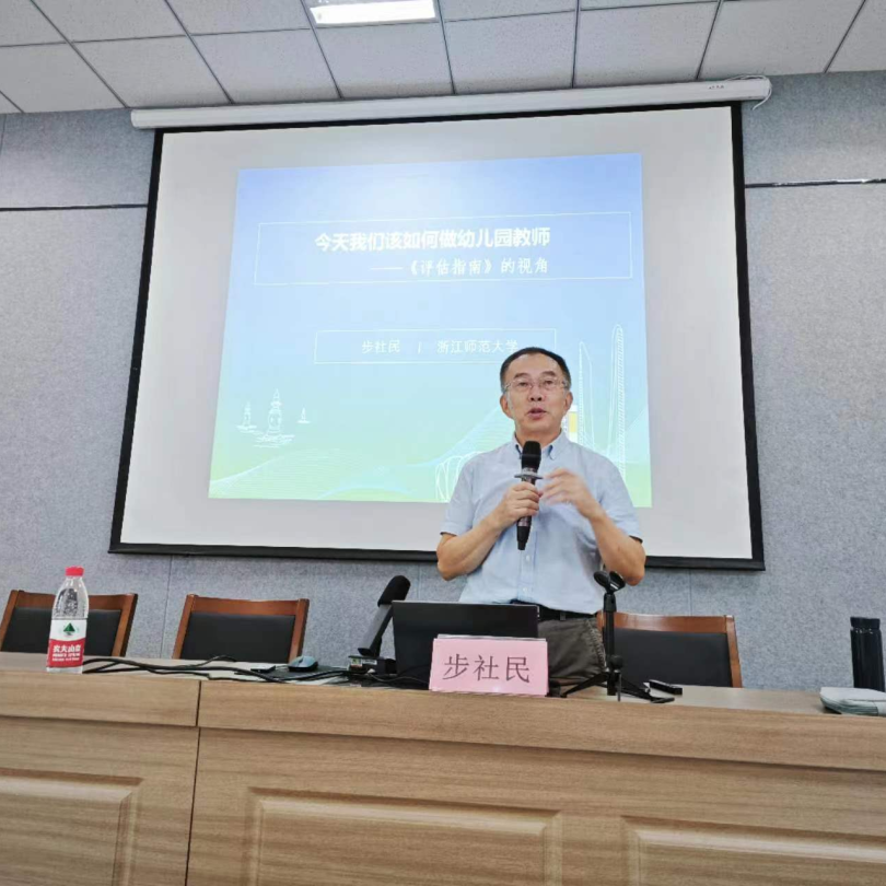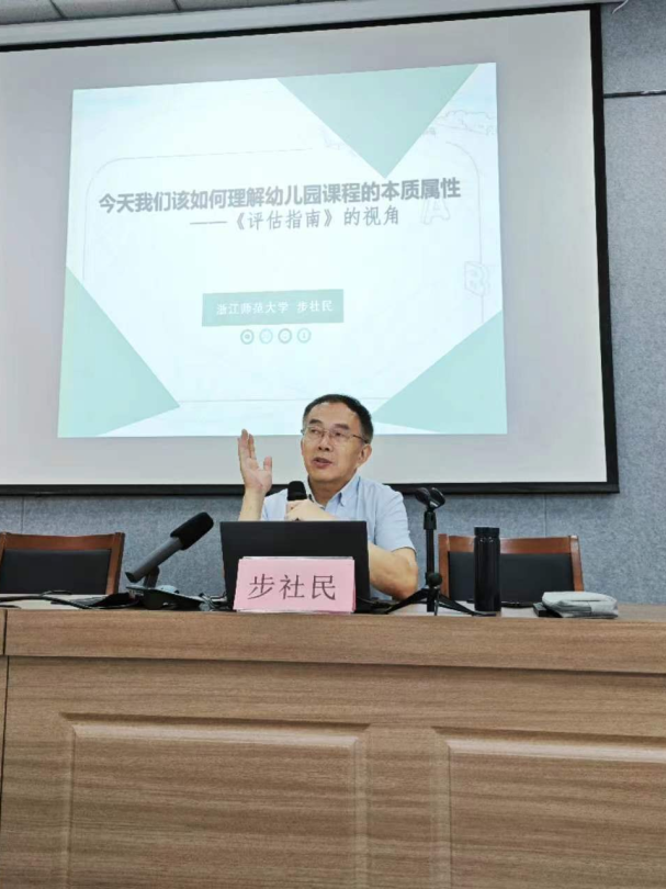 開班儀式結(jié)束后,浙江師范大學(xué)兒童發(fā)展與教育學(xué)院教授,上海建橋?qū)W院學(xué)前教育系主任步社民教授為學(xué)員帶來《<評估指南>視角下“今天我們該如何當(dāng)幼兒園教師”》的主題講座。步教授從關(guān)于幼兒園保育教育質(zhì)量之本、導(dǎo)向的幼兒園專業(yè)成長意蘊(yùn)、視域中教師專業(yè)成長階梯三個方面闡述,針對現(xiàn)如今在AI背景下“教師該是什么樣子?”,倡導(dǎo)教師應(yīng)成為幼兒的“支持者、合作者和引導(dǎo)者”。
