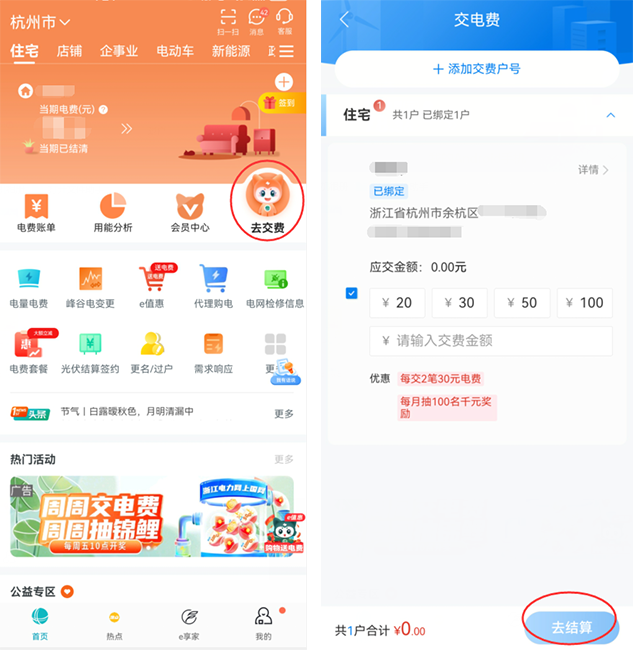 交電費(fèi),請(qǐng)認(rèn)準(zhǔn)官方渠道!網(wǎng)上國(guó)網(wǎng)App首頁(yè)點(diǎn)擊【去交費(fèi)】,輸入交費(fèi)金額,點(diǎn)擊【去結(jié)算】,有優(yōu)惠券或紅包的記得抵扣使用哦。