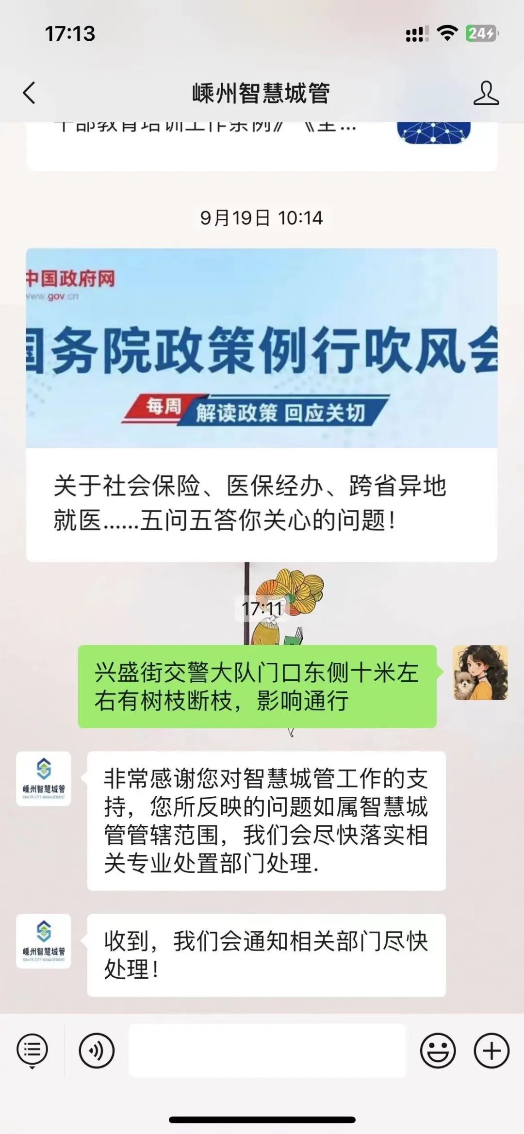 <問題描述>:?jiǎn)栴}地址+問題具體描述,如:興盛街交警大隊(duì)門口東側(cè)十米左右有樹枝斷枝