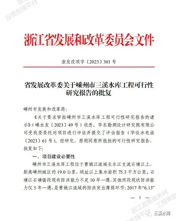 2023年10月20日,浙江省發(fā)改委正式批復(fù)嵊州市三溪水庫工程可行性研究報(bào)告。