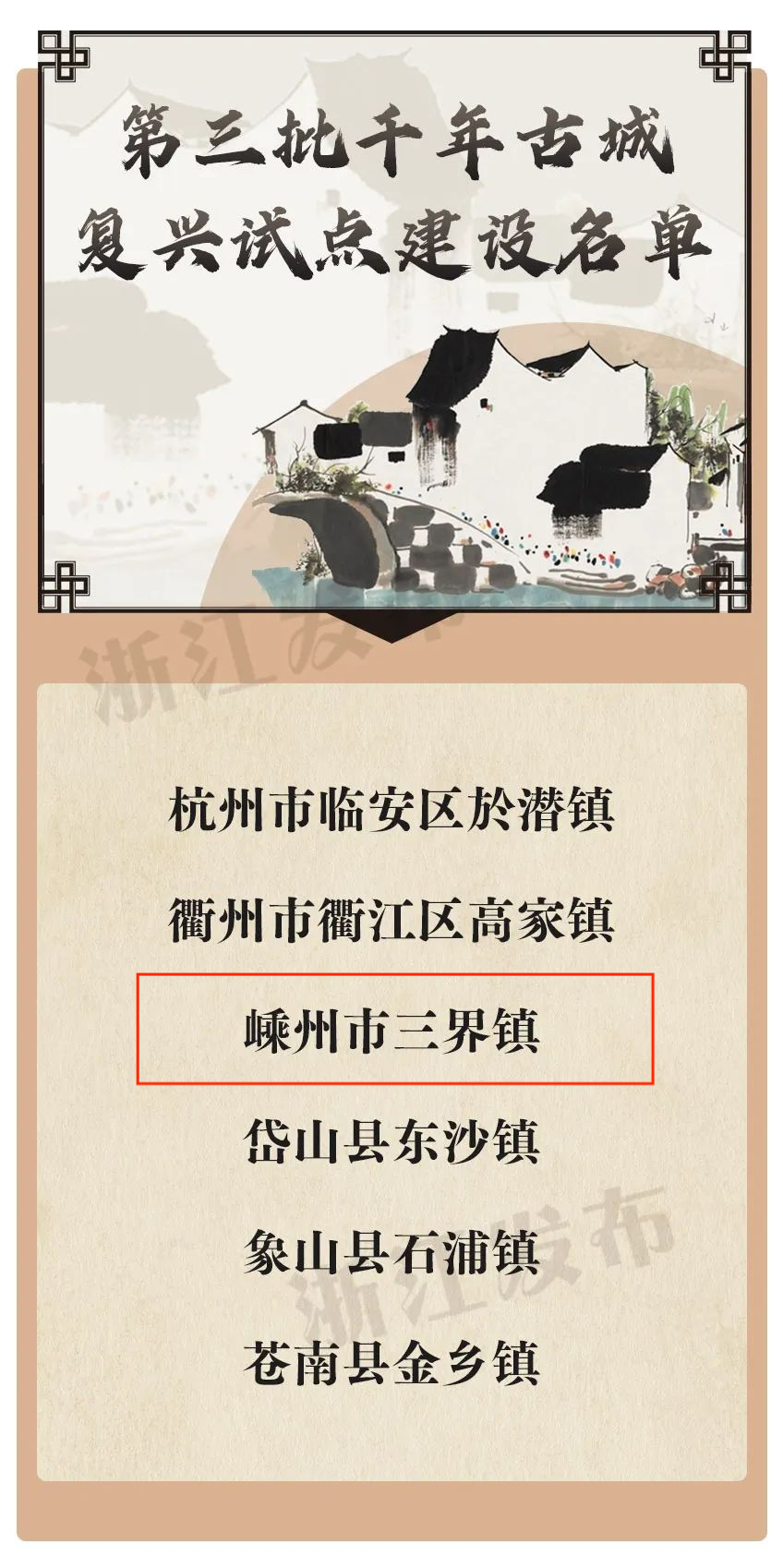 根據(jù)《浙江省人民政府辦公廳關(guān)于印發(fā)浙江省千年古城復(fù)興試點(diǎn)工作方案的通知》精神,經(jīng)省政府同意,確定6地第三批千年古城復(fù)興試點(diǎn)單位。其中,嵊州市三界鎮(zhèn)入選。