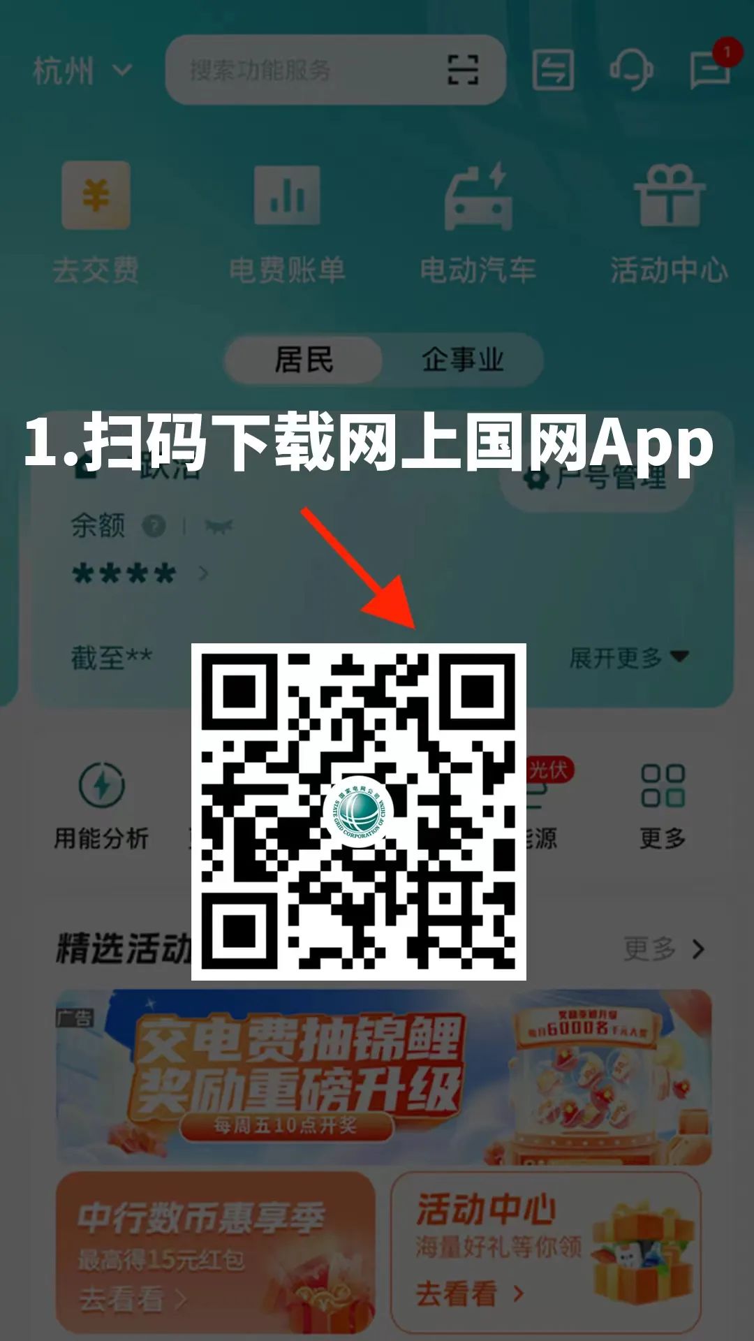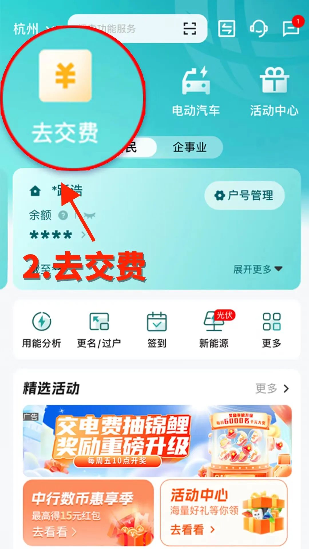 ①掃碼下載并登錄網(wǎng)上國(guó)網(wǎng)App,首頁(yè)點(diǎn)擊【去交費(fèi)】。