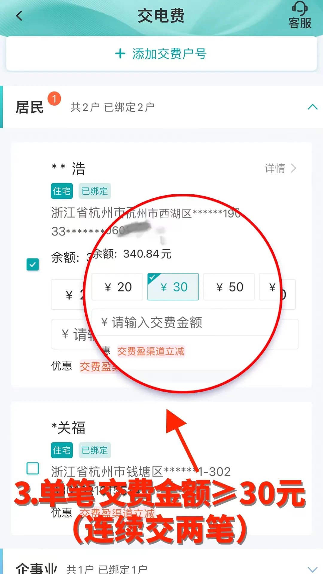 ②同一賬號(hào)給相同戶號(hào)連續(xù)交費(fèi)2筆30元及以上電費(fèi)。