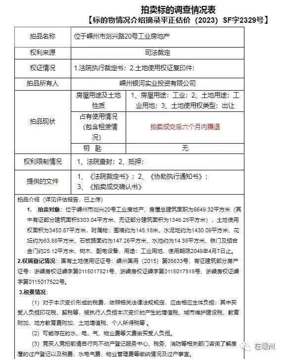 一、拍賣標的:位于嵊州市剡興路20號工業(yè)不動產,估價對象權利人嵊州銀河實業(yè)投資有限公司,房屋總建筑面職為6649.32平方米(其中有證部分建筑面積5303.04平方米、無證部分建筑面積為1346.28平方米),土地使用權面積為3450.87平方米,附屬物:圍墻約為148.18米、水泥地約為1430.09平方米、花壇約為63.88平方米、石板路面約為147.26平方米、水池約為14.38平方米、鐵門及鋁合金門約25.12平方米、樹木、配電設備,用途:工業(yè)用地,使用期限2049年4月7日止。國有土地使用證證號:嵊州國用(2015)第05633號,有證建筑部分房產證號:浙嵊房權證嵊字第0115017521號、浙嵊房權證嵊字第0115017518號、浙嵊房權證嵊字第0115017522號。
