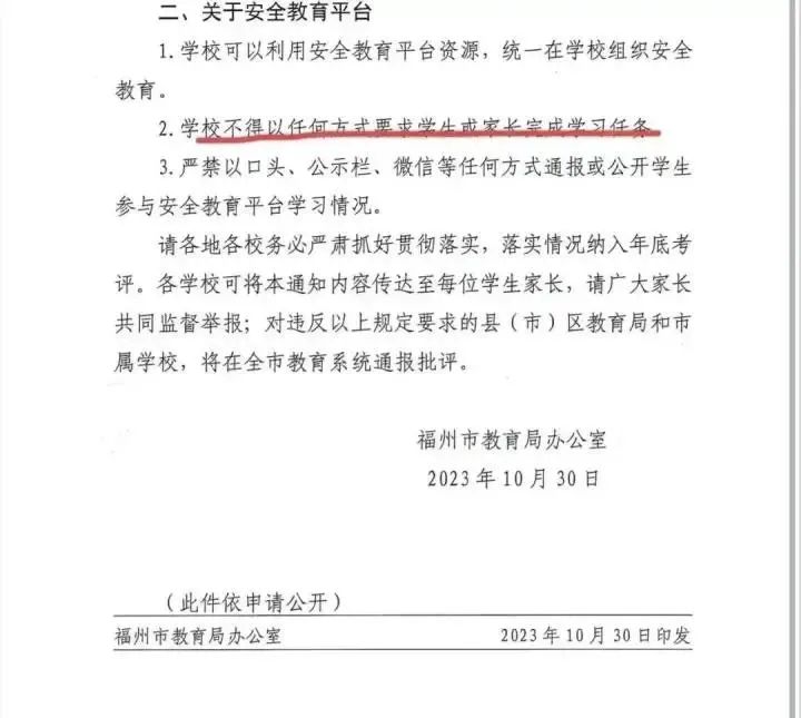 除“開學(xué)安全第一課”外,允許師生和學(xué)生家長(zhǎng)有選擇性參加“平臺(tái)”在線學(xué)習(xí),不得以任何方式強(qiáng)制要求學(xué)生或家長(zhǎng)完成在線學(xué)習(xí)任務(wù)。嚴(yán)禁以口頭、公示欄、微信等任何方式通報(bào)或公開學(xué)生參與平臺(tái)在線學(xué)習(xí)情況,嚴(yán)禁月末、期末集中突擊組織在線學(xué)習(xí),嚴(yán)禁教師或?qū)W生家長(zhǎng)替代學(xué)生完成在線學(xué)習(xí)。 今后全市各地各?!捌脚_(tái)”學(xué)習(xí)的情況,不再納入年度全市學(xué)校安全目標(biāo)責(zé)任管理考核指標(biāo)扣分項(xiàng)目。 泉州市教育局不再統(tǒng)一組織全市學(xué)生參加“全國(guó)中小學(xué)生安全知識(shí)網(wǎng)絡(luò)競(jìng)賽”活動(dòng)。