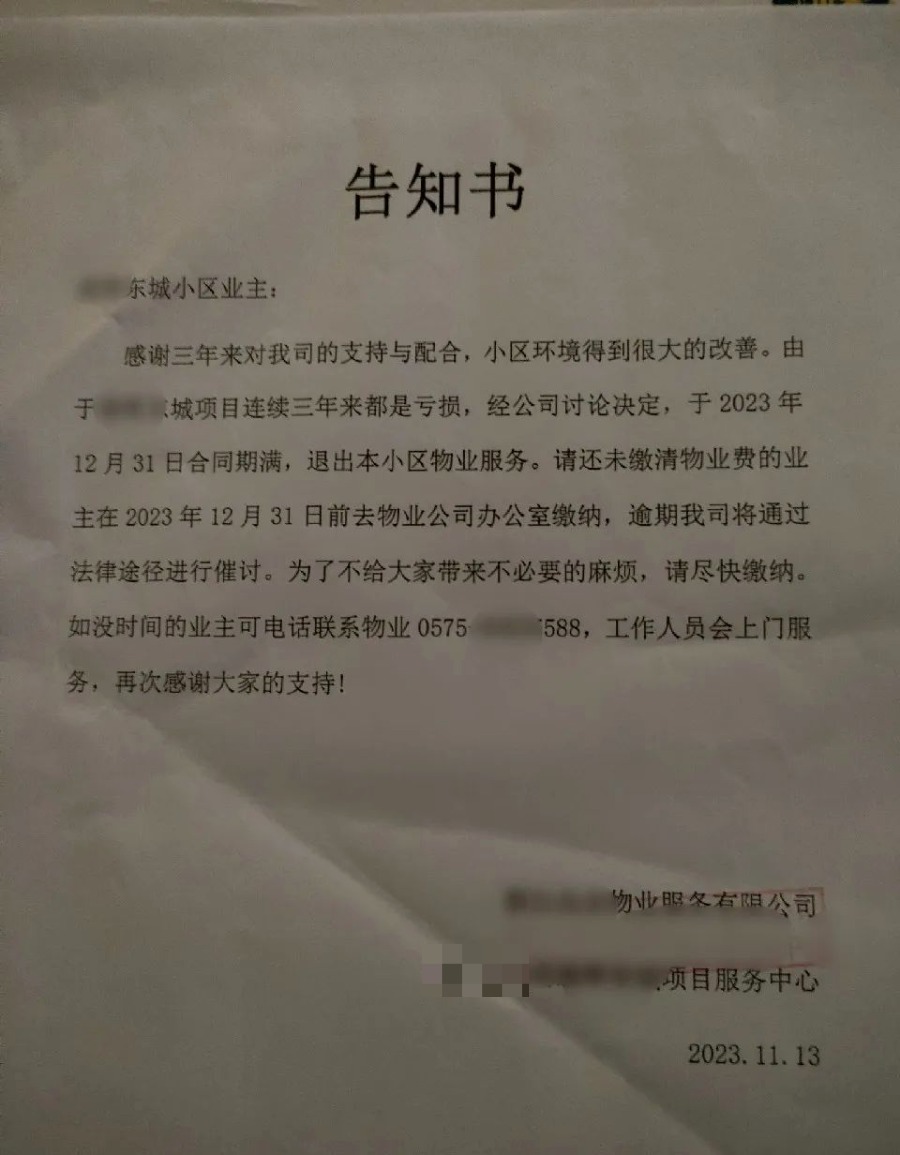 城東某小區(qū)業(yè)主的物業(yè)費(fèi)看來(lái)是難收,物業(yè)貼出了告知書,管理小區(qū)三年經(jīng)濟(jì)都是虧損,所以決定2024年度物業(yè)不再服務(wù)該小區(qū)了,退出該小區(qū)項(xiàng)目了。