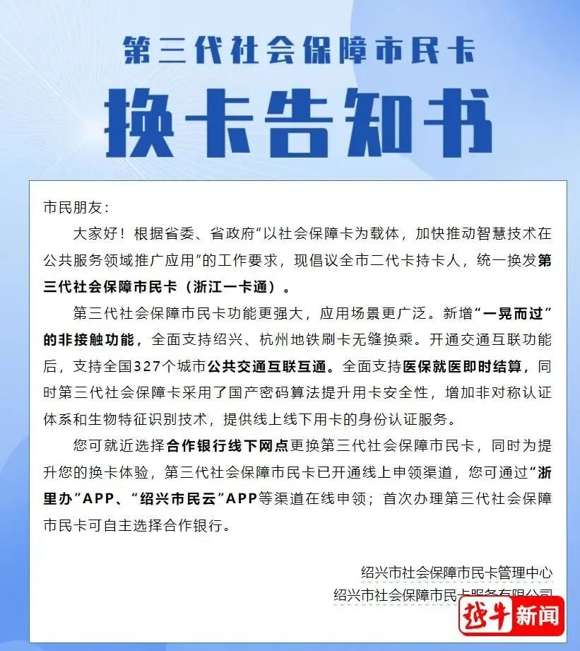 越牛新聞?dòng)浾咦⒁獾剑敖B興市民卡”微信公眾號(hào)此前就發(fā)布了《第三代社會(huì)保障市民卡換卡告知書》,提醒市民及時(shí)更換新的社保卡。