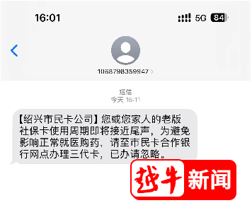 昨日下午,有不少市民收到了紹興市民卡公司發(fā)來的一條短信:您或您家人的老版社??ㄊ褂弥芷诩磳⒔咏猜暎瑸楸苊庥绊懻>歪t(yī)購(gòu)藥,請(qǐng)至市民卡合作銀行網(wǎng)點(diǎn)辦理三代卡,已辦請(qǐng)忽略。