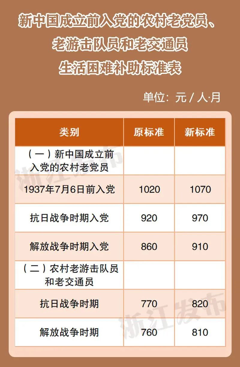 對中華人民共和國成立前加入中國共產(chǎn)黨的農(nóng)村老黨員和未享受離退休待遇的城鎮(zhèn)老黨員調(diào)整生活補(bǔ)貼標(biāo)準(zhǔn),月補(bǔ)貼標(biāo)準(zhǔn)調(diào)整為:1937年7月6日前入黨,提至1070元;抗日戰(zhàn)爭時期入黨,提至970元;解放戰(zhàn)爭時期入黨,提至910元。
