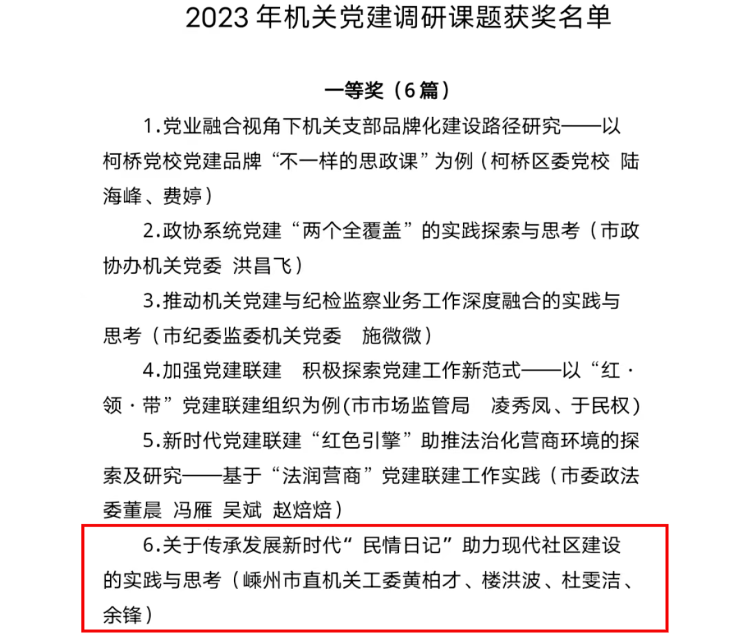 近日,2023年紹興市機(jī)關(guān)黨建研究課題評選結(jié)果公布,嵊州市選送的調(diào)研課題《關(guān)于傳承發(fā)展新時(shí)代“民情日記”助力現(xiàn)代社區(qū)建設(shè)的實(shí)踐與思考》獲一等獎(jiǎng)。
