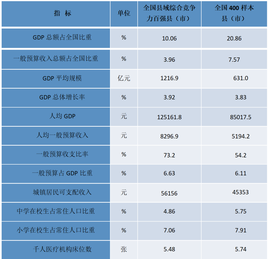 表1 全國縣域綜合競爭力百強縣(市)與400樣本比較