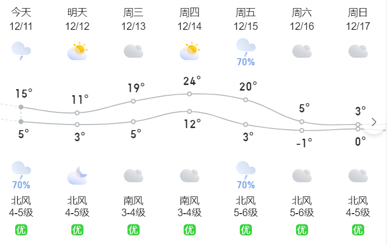 今天最高氣溫:15~17℃,比昨天偏低5℃左右;明天最低氣溫:5~6℃,比今天偏低3℃左右;后天陰轉(zhuǎn)小雨,4~18℃。