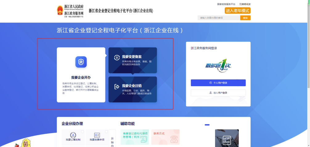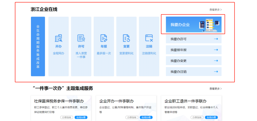 (https://www.zjzwfw.gov.cn/zjservice/front/index/page.do),在頁面中間部位找到“浙江企業(yè)在線模塊”,點擊“我要辦企業(yè)”或“我要辦變更”或“我要辦注銷”進行申報。