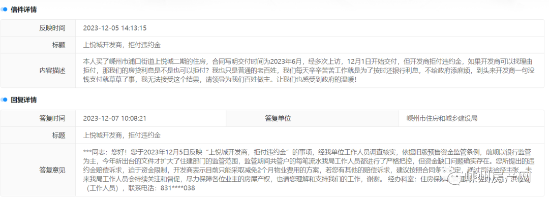 ***同志: 您好!您于2023年12月5日反映“上*城開發(fā)商,拒付違約金”的事項(xiàng),經(jīng)我單位工作人員調(diào)查核實(shí),依據(jù)舊版預(yù)售資金監(jiān)管條例,前期以銀行監(jiān)管為主,今年新出臺(tái)的文件才擴(kuò)大了住建部門的監(jiān)管范圍,監(jiān)管期間共管戶的每筆流水我局工作人員都進(jìn)行了嚴(yán)格把控,但資金缺口問題確實(shí)存在。您所提出的違約金賠償訴求,迫于資金限制,開發(fā)商表示目前只能采取減免2個(gè)月物業(yè)費(fèi)用的方案,若您有其他的賠償訴求,建議按照合同條款約定,通過司法途徑主張。未來我局工作人員會(huì)持續(xù)關(guān)注和督促,盡力保障各位業(yè)主的房屋產(chǎn)權(quán),也請(qǐng)您理解和支持我們的工作,謝謝。經(jīng)辦科室:住房保障和管理科,經(jīng)辦人員:洪**(工作人員),聯(lián)系電話:831****038