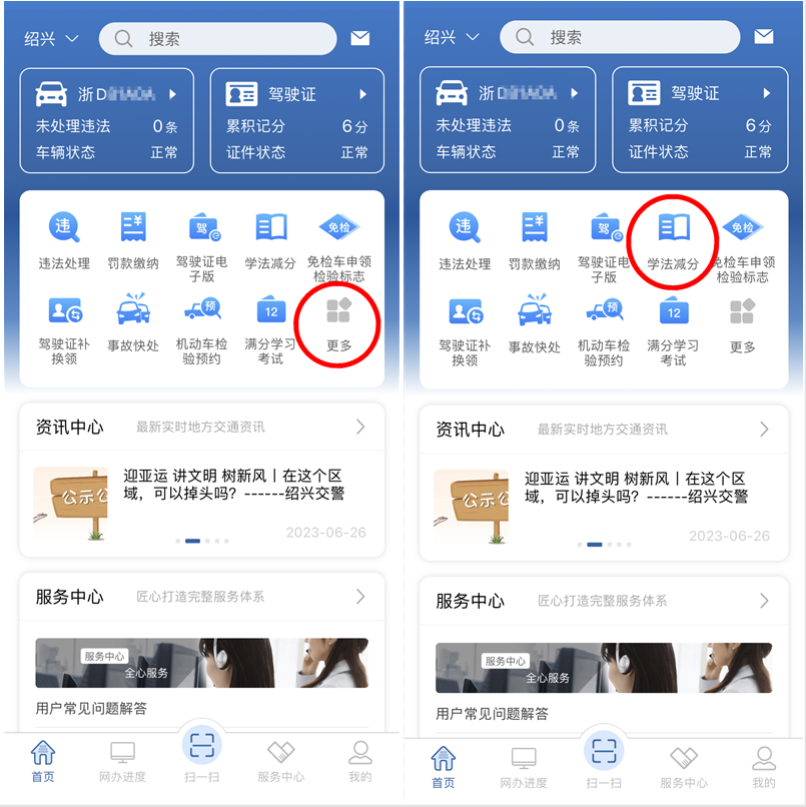 用戶登錄“交管12123”手機APP,在首頁,點擊“學法減分”按鈕→進入學法減分申請頁面,或者在首頁點擊“更多”→進入業(yè)務中心頁面,在“學習教育業(yè)務”模塊下點擊“學法減分”按鈕→進入學法減分申請頁面→選擇“網(wǎng)上學習考試”,點擊“申請”按鈕。