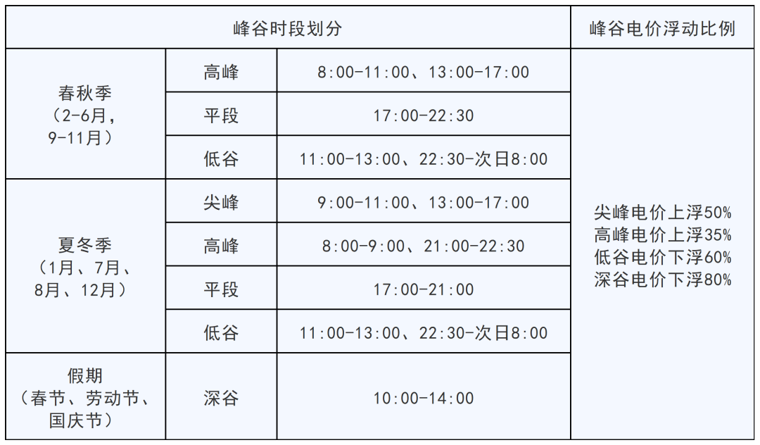 取消了春秋季尖峰時段,對應(yīng)調(diào)整為高峰時段,上浮比例由原80%下調(diào)為35%。
