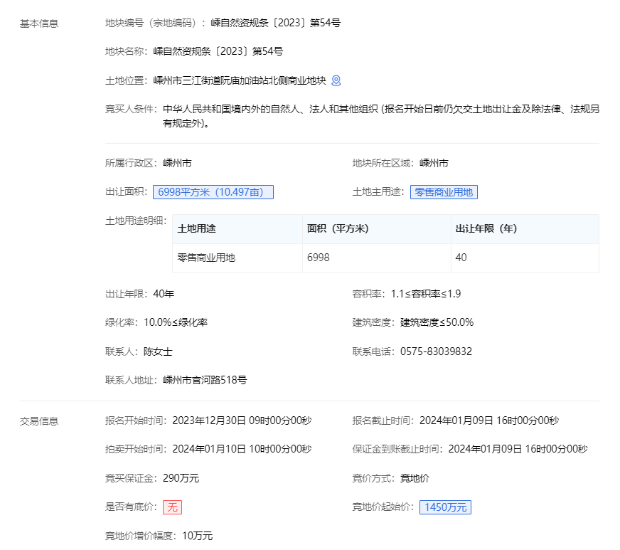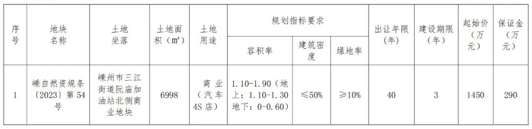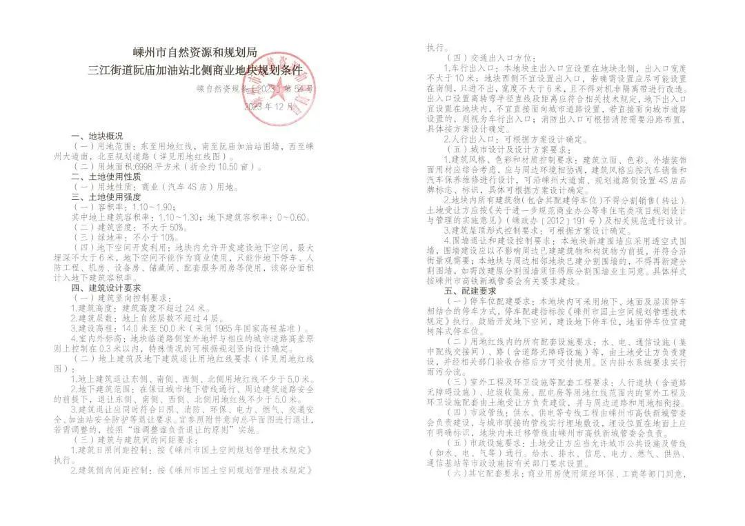 經(jīng)嵊州市人民政府批準(zhǔn),嵊州市自然資源和規(guī)劃局決定于2024年1月10日上午10時00分,以網(wǎng)上拍賣方式公開出讓嵊州市三江街道阮廟加油站北側(cè)商業(yè)地塊?,F(xiàn)將有關(guān)事項公告如下: