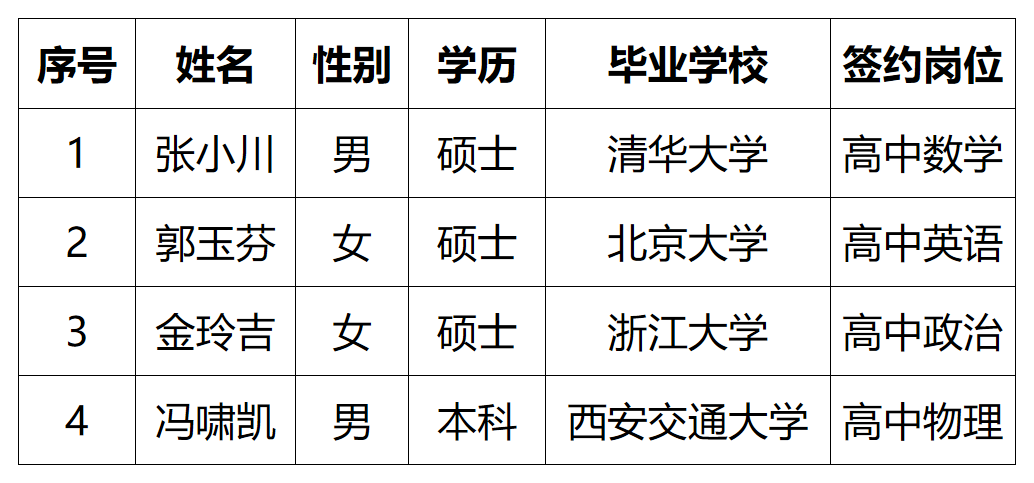 經(jīng)資格審查和組織考試,共有4人被預聘為我校教師,現(xiàn)將招聘結(jié)果公告如下: