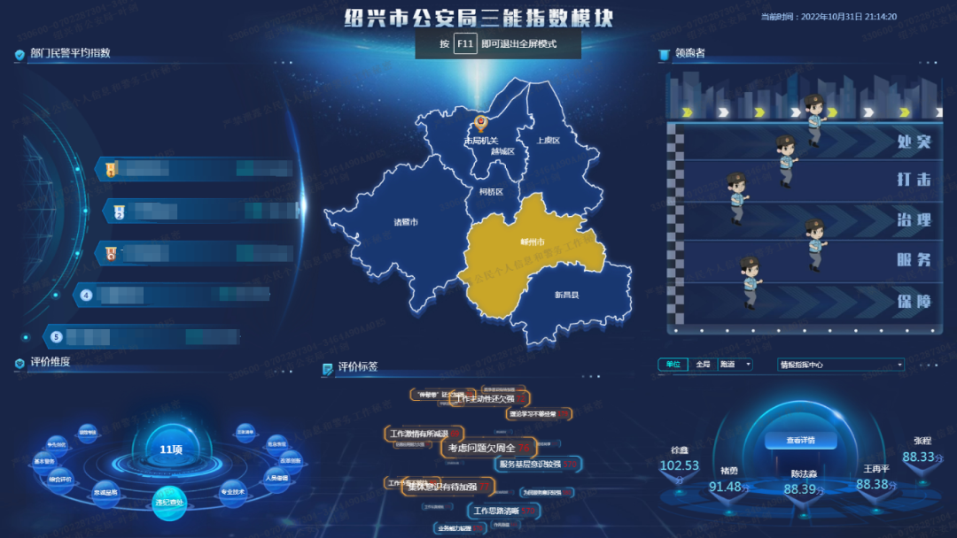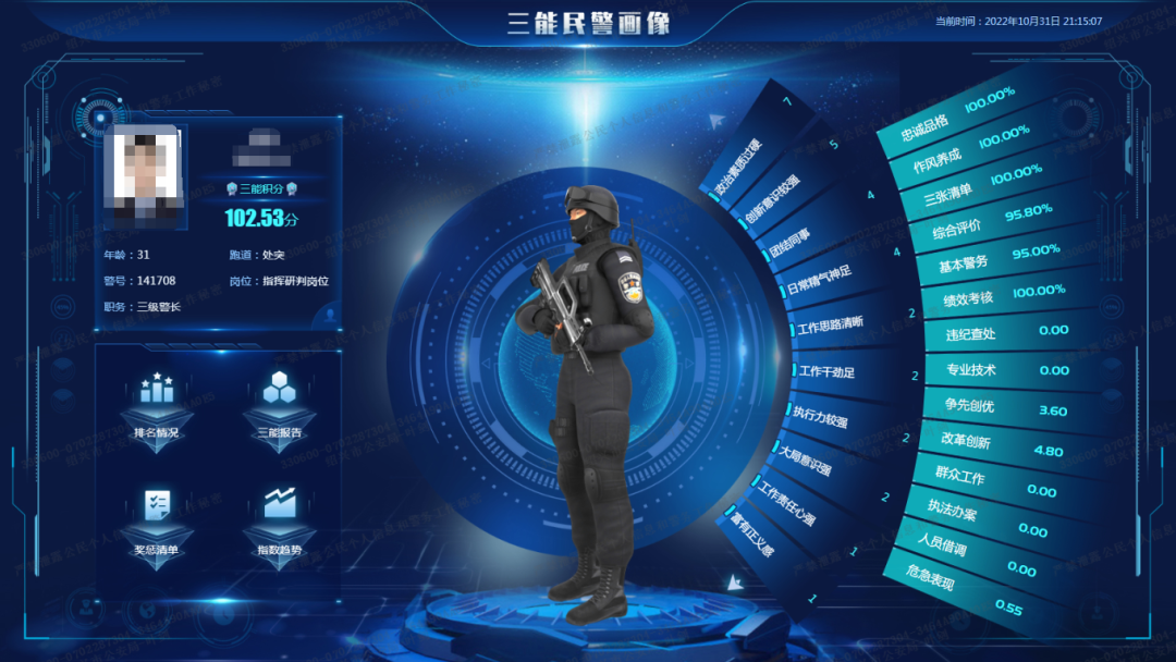 聚焦隊伍建設(shè)智能化、數(shù)字化轉(zhuǎn)型,創(chuàng)新推出“三能”積分評價體系,配套搭建“三能指數(shù)”應(yīng)用模塊,通過自動抓取、智能導(dǎo)入等多樣化數(shù)據(jù)采集方式,基本實現(xiàn)政工數(shù)據(jù)“零加工”。對照省廳“三能”通用標(biāo)準(zhǔn),細(xì)化14個維度24項評價指標(biāo)和68個正負(fù)面標(biāo)簽,通過大數(shù)據(jù)模型運算,量化生成全警“三能”積分,引入民警積分按“跑道、單位、全局”三種方式分類排名,并深化積分在評先評優(yōu)、典型選樹、提拔任免等方面的具體應(yīng)用,實現(xiàn)民警履職能力可視化、晾曬競比常態(tài)化、獎勵激勵個性化。