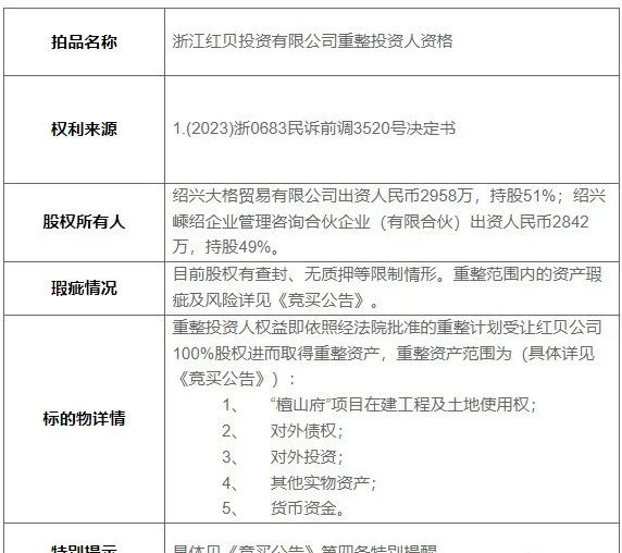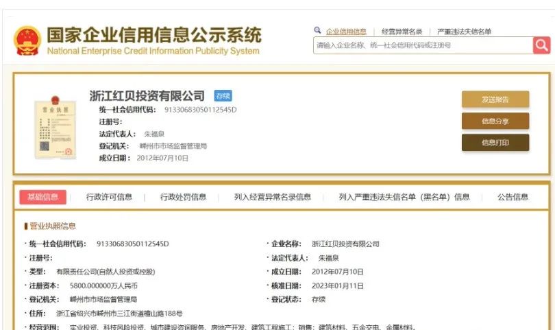 浙江紅貝投資有限公司成立于2012年07月10日,,住所地:浙江省紹興市嵊州市三江街道檀山路188號。經(jīng)營范圍包括實業(yè)投資、科技風險投資、城市建設咨詢服務、房地產(chǎn)開發(fā)、建筑工程施工;銷售:建筑材料、五金交電、金屬材料。