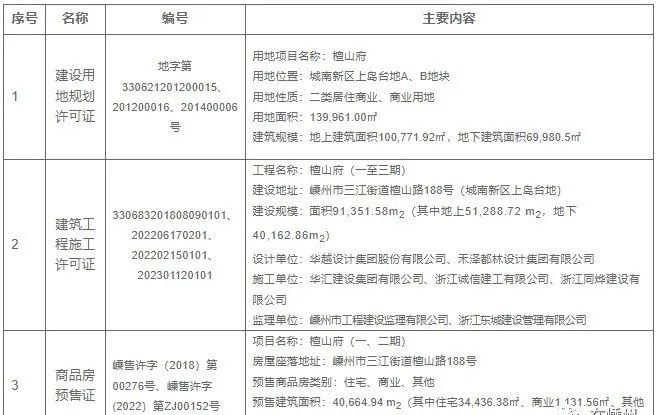 目前,“檀山府”項目的建設規(guī)劃許可共六期,建設規(guī)劃許可證分別為建字第330683201820021號、建字第330683202202001號、建字第330683202202008號、建字第330683202202013號、建字第330683202202014號、建字第330683202202015號,該項目要求兩地塊整體規(guī)劃、統(tǒng)籌開發(fā),六期全部施工完畢后一并交房、辦證。許可情況具體明細如下: