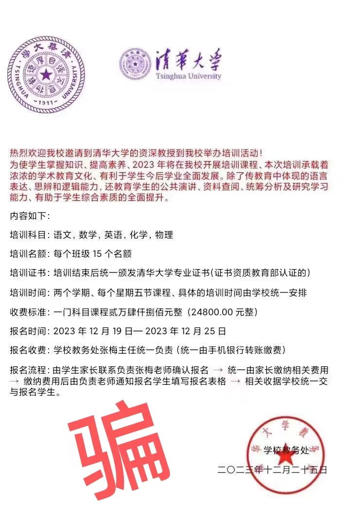 12月23日上午,林先生手機QQ收到一條好友申請,通過后發(fā)現(xiàn)對方昵稱是自己女兒的名字,便以為這就是自己的“女兒”?!芭畠骸狈Q,學(xué)校邀請到了“清華大學(xué)”教授到學(xué)校進行學(xué)業(yè)培訓(xùn),并發(fā)來一張培訓(xùn)通知書的圖片,林先生看到圖片內(nèi)有課程時間、費用、公章和報名流程。“女兒”稱,因為學(xué)校害怕學(xué)生自己亂報名,所以需要家長直接和“老師”聯(lián)系。
