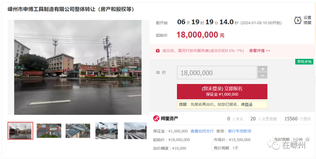 近日,阿里拍賣平臺上,嵊州市申博工具制造有限公司整體轉(zhuǎn)讓(房產(chǎn)和股權等),起拍價1800萬。