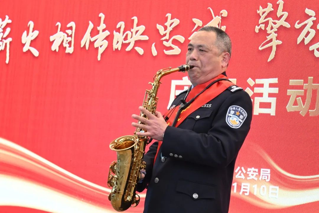 退休民警楊兆銘用薩克斯吹奏