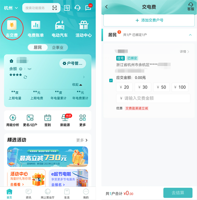 網(wǎng)上國網(wǎng)App首頁點擊【去交費】,選擇要交費的戶號和交費金額,點擊【去結(jié)算】就可以啦。