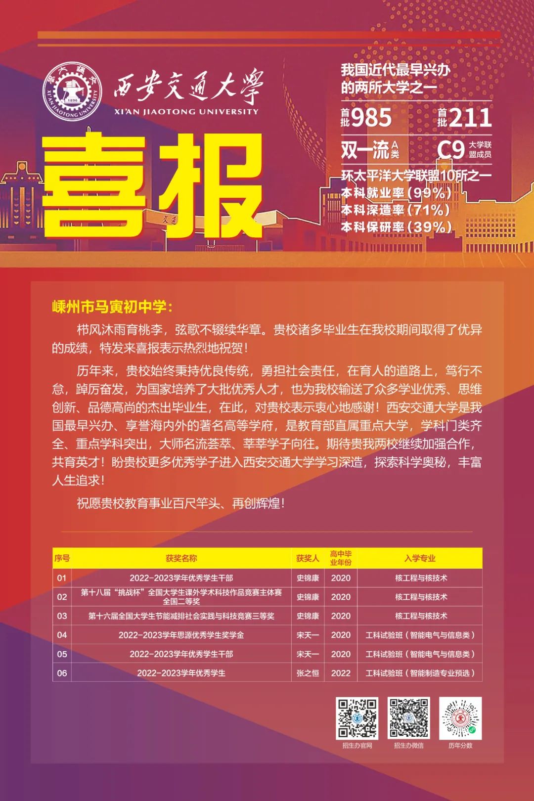 2024新年報喜!馬寅初中學收到了浙江大學與西安交通大學等高校的感謝信。感謝信中,浙江大學、西安交通大學等高校感謝馬寅初中學為其輸送了一批批優(yōu)秀學子。